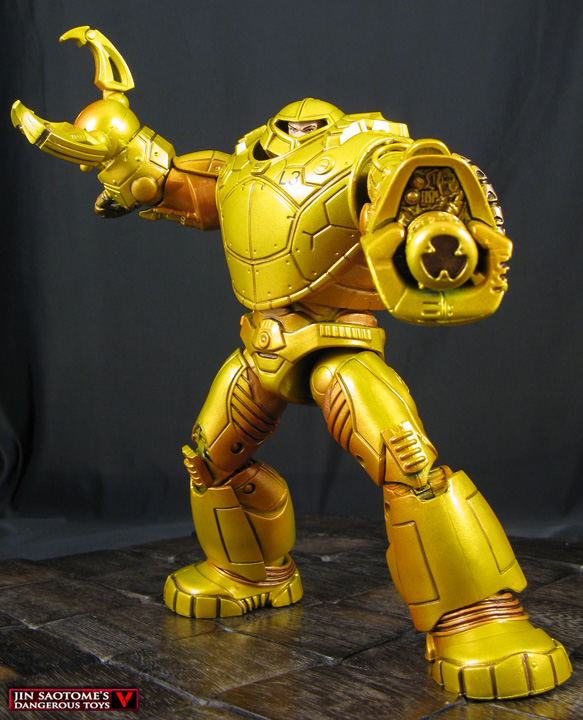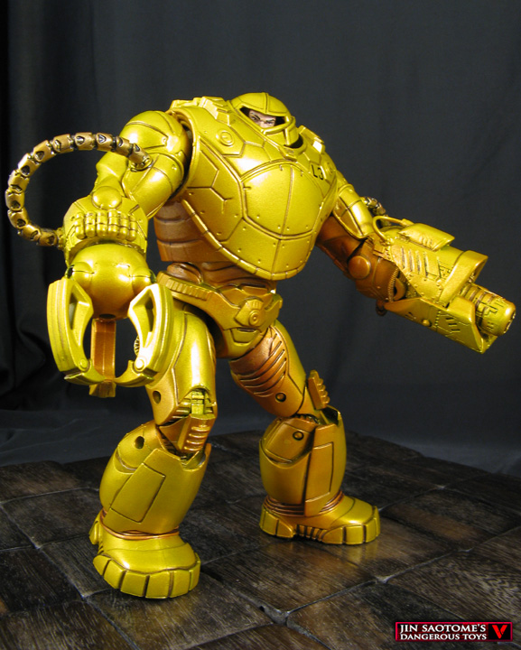They're big, they're deadly, they're somewhat unwieldy, they're SHIELD's Mandroid battle armors! This custom Marvel Legends SHIELD Mandroid was created from the BAF Mandroid that you could assemble by buying all the Captain America Infinite Legends figures. I turned it into the comic book version by adding a claw and gun arm, hollowing out the head and adding a SHIELD agent head inside as you can see the human faces through their visors in the comic versions. An airbrushed metallic gold-yellow paint job with dark gold shading was used to complete the image along with some added joint detail. Now the SHIELD Mandroid is ready to take on any Metahuman it encounters!