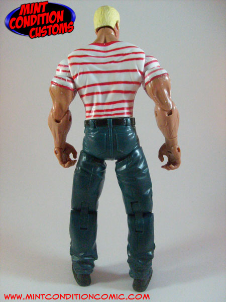 I sanded off the Strike Force logo on Tito Santana's shirt, as well as the goatee on Kevin Nash's face. Then I painted Kevin's hair a light yellow with a white wash to get a blonde look, and did the same to his eyebrows. I used a mix of a flesh tone, some red, and a little black to paint the scar on his eye. The black was used because I noticed it left kind of a burnt edge to the paint which would look great for a scar.