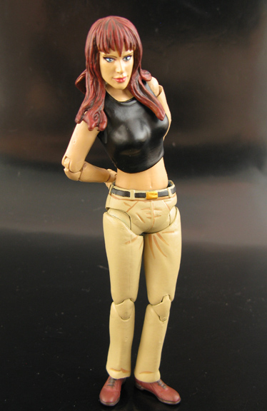Here's Spiderman's gal Mary Jane Watson made into a 6" Marvel Legends figure based on her classic comic appearances. She's made from the body of a Shocker Toys Katchoo, arms from a deluxe Buffy figure, and resculpted Elektra head. She wields a purse and cellphone so she can call Peter and tell him to swing by the store for milk after beating up the Lizard.