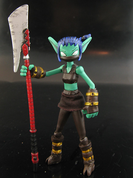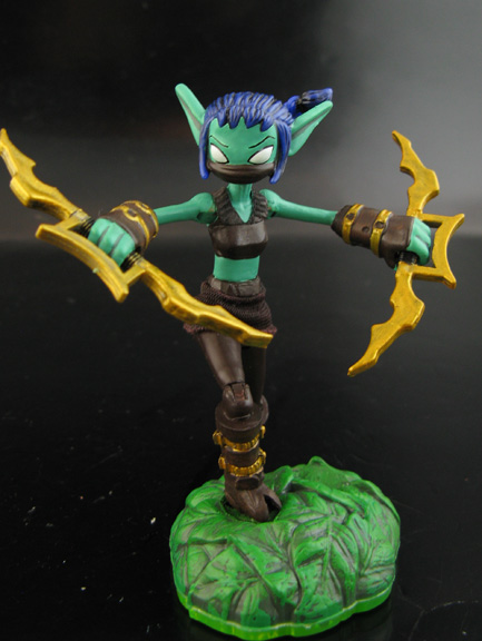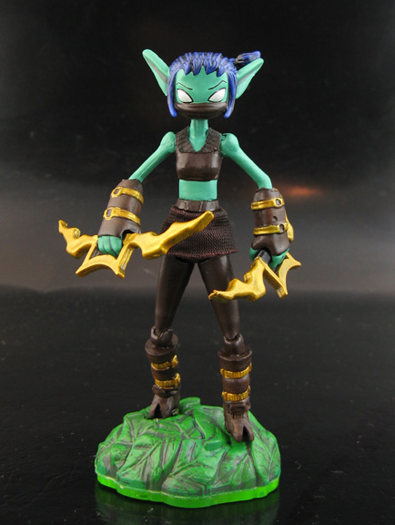 Stealth Elf is all grown up! Instead of just adding joints to the base Skylander character as I have in the past I ditched her chibi body and kept only her head and lower arms. Ahsoka Tano's body was used, some lower legs from another SW character, the feet thebn reshaped luke hooves. The fangs were dremelled out of her hands so he could hold other weapons and upgraded pook blades were made from various fodder pieces. Once painted she resembles a grown-up Stealth Elf is Skylanders were to perhaps be made in a 1:18 action figure scale. She still works with the game however, able to re-attach to her base which has the RFID chip inside.