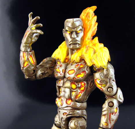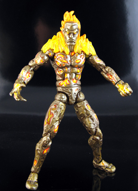 Burning his way out of the pages of the Spiderman comic comes one of the hottest villains, the Molten Man. He was made from a DCU Major Force head, spiderman classics Carnage body, and movie spawn hands. I used multiple metallic paints with various techniques and then filled in his burning inner core sections with different shades of yellow/orange. The back flames were from a FF movie human torch figure I believe. Now Molten Man is ready to torch the opposition!