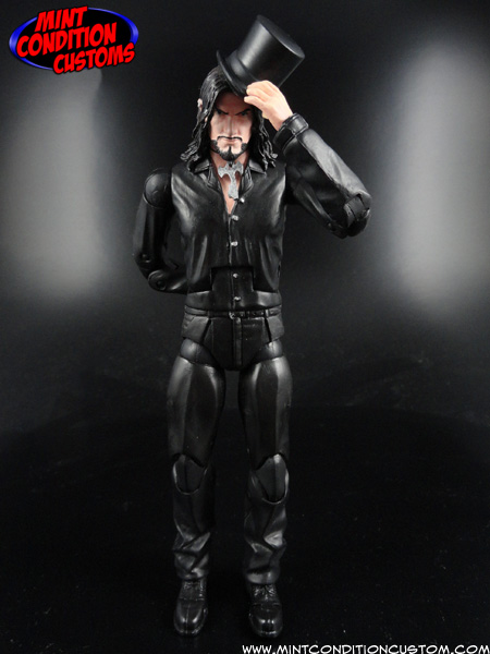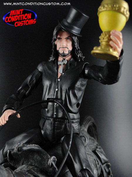 The custom set I made him revolves around his “Black Unicorn” album. The actual figure itself was made using the body of a Diamond Select Toys Deluxe Angel, the head from a Marvel Legends Dr. Strange, the hair from a Lord of the Rings Boromir, and the top hat from a DC Universe Classics Zatanna. I resculpted the collar of the shirt so it would be more open, and made a smaller version of Voltaire’s signature key blade necklace myself out of carved down polystyrene strung around the figure’s neck with black thread. I also heated up the figure’s left hand and let it cool down around the chalice I gave the figure, so it would perfectly fit in his hand. The reason I chose the ML Dr. Strange head is actually a funny story. Not many people know this, but that figure’s head was actually sculpted after Voltaire’s likeness. A friend of his was working on the figure for Toybiz many years ago and thought that Voltaire had the perfect face for him to use as a reference for Dr. Strange’s face. So with that knowledge, how could I possibly use any other head, but one that was made to look just like him? I had to sculpt his full beard on, and shave down the back of the head greatly to fit the Boromir hair on, then just glued the top hat to the hair. I also used thin styrene rods to pierce both of his ears.
