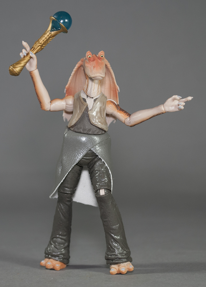 Surprisingly, I don't hate this piece, regardless of how deeply I despise Jar Jar. Although the coloration is slightly off, the articulation has improved somewhat over the Movie Heroes version and Hasbro even included a soft-goods skirt, which allowes the figure to sit atop a kaadu fairly well.