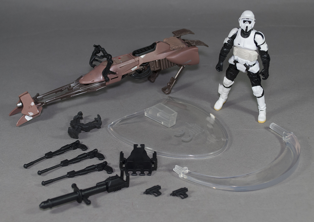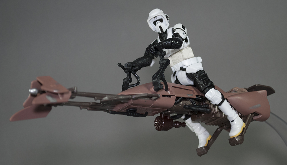 This is said to be the ultimate Speeder Bike set offered by Hasbro to date! The detail is flawless and the updated Biker Scout (from 2006) features improved articulation so he can actually pilot the Speeder Bike properly. The exploding feature is now gone, and the set now includes a display stand!