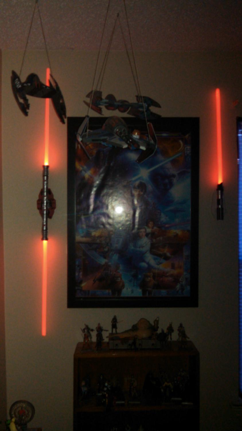 finally hung up my Science Tech(?) lightsabers i got from TrU a couple of weeks back. Shows what they look like w/ the lights off and on heh