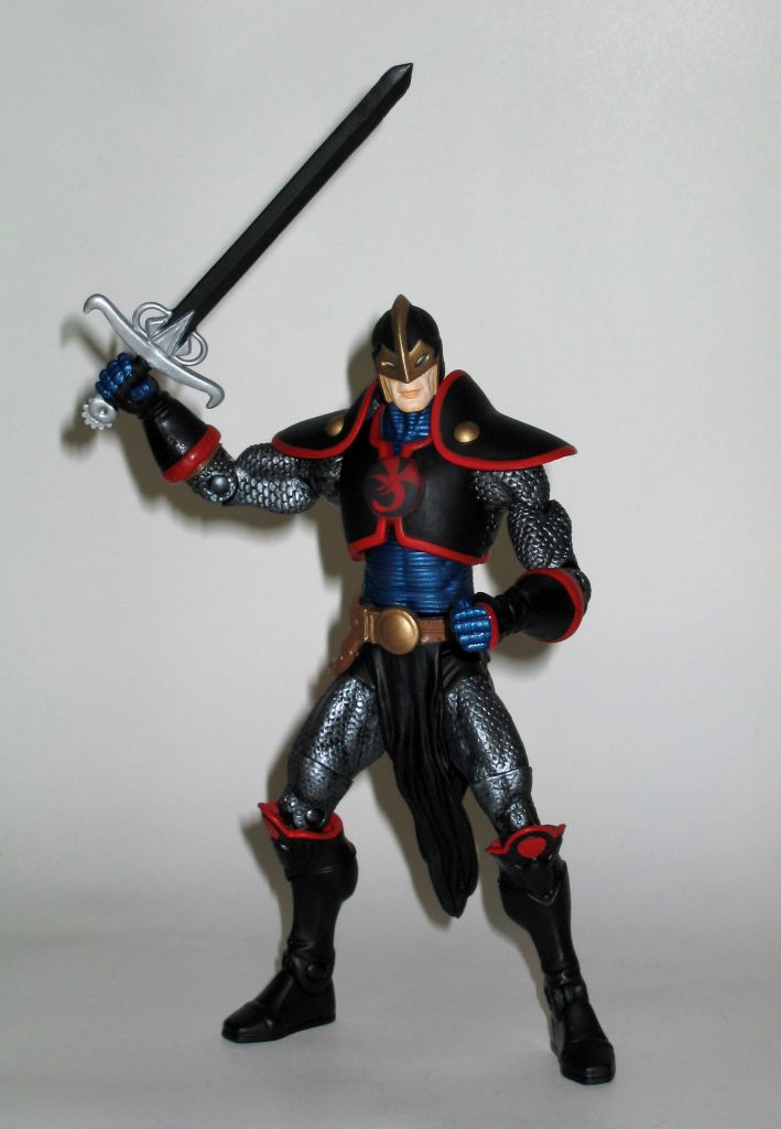 I recently purchased a Hasbro Marvel Legends Black Knight off of eBay, and I was disappointing in it's condition when I received it. The Auction had a bad picture, and I couldn't really make out the condition from the photo. The paint was really worn and the sword was actually chewed up on the end. So I decided to give the Black Knight a little repair job and upgrade. I cracked the body apart, and modded the torso to accept Aquaman's shoulders and arms. I modded the Aquaman forearms to attach the Black Knight gauntlets which still retains the twist articulation. For the lower body I used a DCSH Superman waist, DCUC Copperhead upper legs, DCUC Golden Pharaoh lower legs, and DCUC Cyborg feet. I used my Dremel to smooth out the teeth marks on the sword, and used putty to fill in the nick's in the sword that were missing. Then finally I gave him a full paint job. Let me know what you all think.