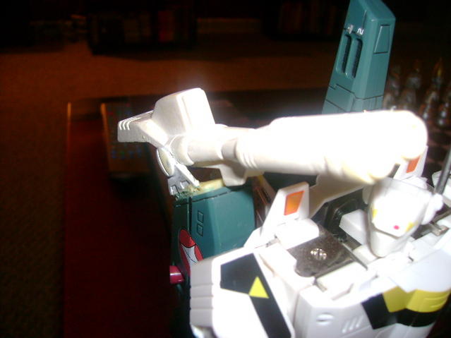 nightmareb4macross of macrosswold.com who had taken the 1/55 Bandai cannon and remolded it to fit the Toynami 1/55. I purchased the original mold from him and casted the base of the missile launcher detachment from the Appendix thruster. When the mold was cast I attached the cannon to the base and allowed it to dry. Here is what the partial end result looks like. Tell me what you think so far. Thank you.