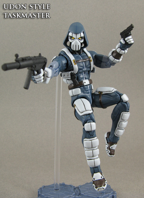 Created for a friend who's a hardcore fan of Taskmaster and Deadpool, this is a custom that really took a lot of sculpting to complete. For this custom Udon Taskmaster I started with the ML 2013 Archangel base (same as Bucky Cap/US Agent without boots and gloves) and modded a hood from the DCU Raven figure. All of Taskmaster's armor, straps, and gear was sculpted from Apoxie Sculpt. His head was Archangel's as the base with his mask sculpted over it, the narrow eyes working perfectly! The energy shield on his right hand is magnetic and can be replaced with a single orange button for a powered-down look. Taskmaster's handguns can be removed from the holsters under his arms, his sword sheath pegs to his back, and he comes with an assortment of guns and edged weapons to get the job done!