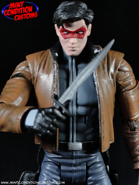 It’s a shame we never got this version of the Red Hood from Mattel in the DC Universe Classics line. We did get Jason Todd as Red Hood, but in a costume he only wore for a few issues. This is clearly the more popular version, so I just had to do my take on the character. He’s made with the upper body of Mr. Terrific, the lower body from Jack Knight Starman, Sportsmaster Boots, Sandman hands, and a Terry McGinnis head. I had to cut Starman’s legs off at the shin and grafted the Sportsmaster boots to them and blended them in with Apoxie Sculpt. Speaker wire was used for the seam on his shirt. The helmeted head is from an electric Superman Blue sculpted over and painted to give a realistic metallic sheen. I gave him holsters for his pistol and knife and made sure they wouldn’t interfere with the articulation. After painting everything up, I gave him a crowbar, and now he’s ready to take his revenge on the Joker and show Batman how to reall clean the streets of Gotham!