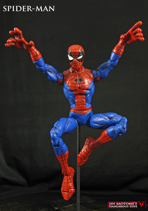 Spider-Man, Spider-man, does whatever a spider can! Over the years he's been drawn many different ways and this custom Marvel Legends Spider-man figure was based on the art by Humberto Ramos. He was made using a Superposable mcFarlane style Spiderman body, series 1 Spiderman legends forearms, hand/feet and head from the Ramos flip-n-zip Spider-Man. The eyes were resculpted all squinty and he was given a wire wrapped webline.