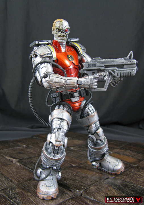 He's part man, part machine, but all deadly! Here's a custom Marvel Legends Deathlok figure that's sure to blow away the competition. He was created from an Extremis Iron Man upper body, Titanium Man lower body, DCU Mr Freeze boots, Mortal Kombat Jax arms, and a retooled ML Deathlok head and backpack. The head originally had an open mouth but it's been closed for a new look. Various hoses and wires were added all over him and a tiny classic SHIELD logo was added to his chest just like the art. A little bit of weathering adds to Deathlok's mechanical appearance and this robotic warrior is ready to fight!