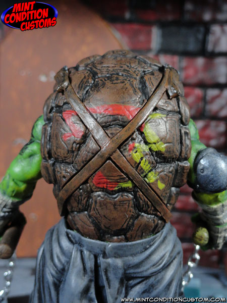 The official Playmates figures for the new Teenage Mutant Ninja Turtles movie leave a lot to be desired, so I decided to fix them in order to make them completely movie accurate. I studied several images and trailer stills in order to get down every detail. Each figure has been fully repainted from head to toe, with spots on their skin, Japanese Kanji on their bandanas and shells, and realistic shading, highlights, and weathering. For Leonardo I used the head from the Combat Warrior figure (the deluxe sized figures), because it’s actually smaller than the basic figure’s head (which is too big), and it sits better on the figure, and added the NYC button on his weapon strap. For Michelangelo, I added the shades around his necklace, and the tattoo on his left arm. On Raphael I added the scar over his lip, the tattoo on his right bicep, and some shades that fit on his forehead. For Donatello, I also used the head from the Combat Warrior figure, because the sculpt was much more detailed, and looked better. I made his glasses out of craft wire, with sewing thread for the tape and painted them to look like tortoiseshell frames. I also used sewing thread for the electrical wiring to connect pieces of his equipment. Of course I also went through and gave all their weapons realistic repaints as well, adding real chain to Mikey’s. And now that the Ninja Turtles actually look like they do from the movie, they’re ready to take down Shredder and the entire Foot Clan. COWABUNGA!