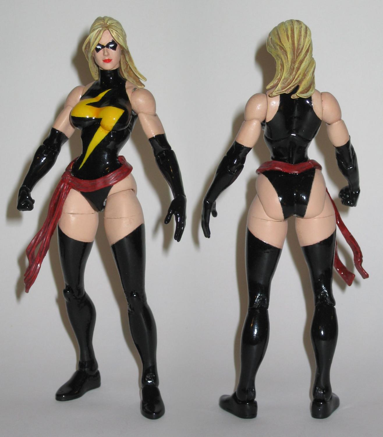 She is a bit of a Frankenstein recipe. The main body is a cut down and re-sculpted DCC Livewire and her legs that have been cut down with Red She-Hulks lower legs and feet grafted onto them, and WWE female arms.