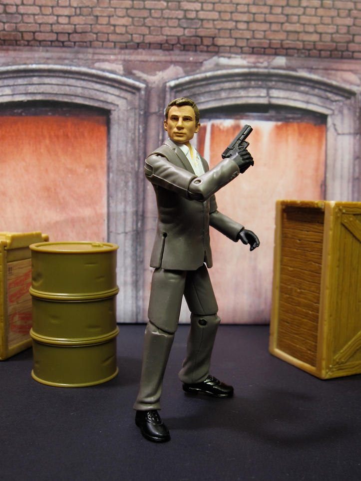 A simple head swap and I now have James Bond running around my 3 3/4" world. I actually need to either paint his hands flesh tone or find a suitable replacement set. So far, none of the flesh-colored GI Joe hands I've tried have fit (it's very surprising how FEW Joe figures actually have bare hands). Or I might get another A-Team character to use their hands. I don't mind the gloves, they kind of look like he's ready to do some killing, but I think he needs bare hands too.