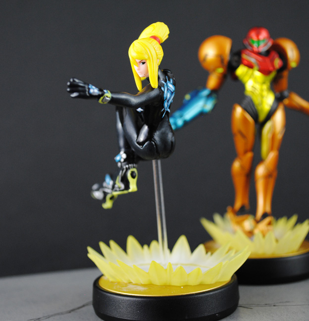 The Nintendo Amiibo characters are nifty little statues and here I've added articulation and a special twist to one, Samus Aran! When the Zero Suit Samus was released I knew what I had to do, an unmasked Samus. Using mini ball joints I made Samus' power suit helmet removable so you could swap on the Zero Suit head. I added shoulder and arm joints so she could aim her arm cannon around and even a tiny magnet inside the helmet so she could hold it in her left hand. A beam effect was added and I repainted the Zero Suit Samus into the black alt costume, giving them both power-up bases. They still work with the Wii U and are now unique Amiibo figures!