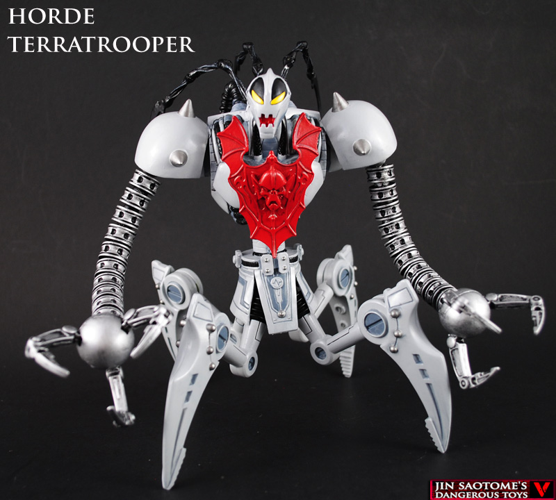 "Angered by the limitations of his Horde Troopers the tyrannical Hordak devises a new set of troopers to cause chaos in Eterina...the Horde Terratroopers! With crab-like legs these troopers are able to scale vertical surfaces with ease and snatch up enemies with their extending mechanical arms. While they cannot fly the Terratroopers can move incredibly fast on land and cover enough ground to surround Hordak's enemy on the battlefield. Even one can pose a serious threat to She-Ra or He-Man if they're unprepared!"