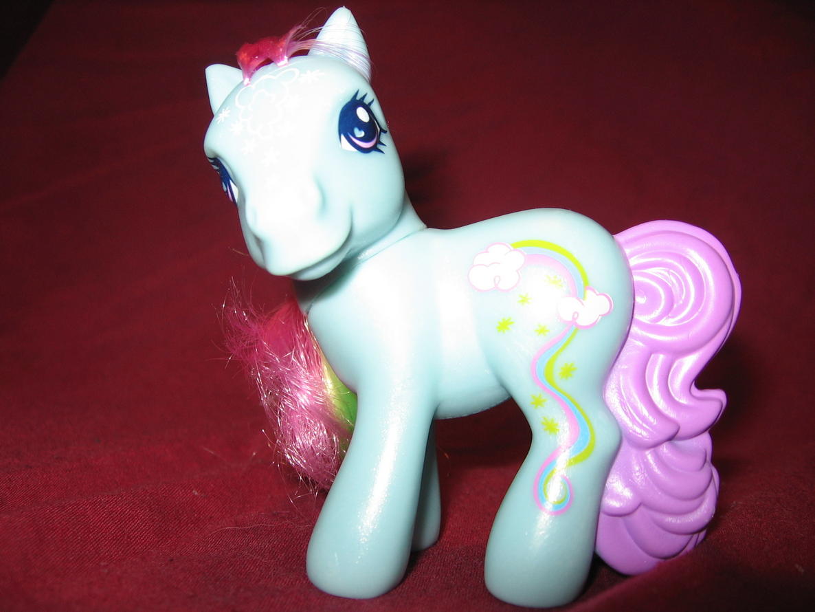The Pony that i aquired for the purpose of this review is named Rainbow Dash. Rain Bow Dash is a sky Blue colored pony with a rainbow and cloud design pained on down the back and rear leg of the pony. She also has a white cloud and star design that is painted down her forehead between the eyes. Rainbow Dash also features real rooted Pink and Green Hair.