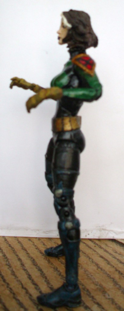In violation of cartoon accuracy, I gave her the collar she only wore in civilian attire. I extended the green down her sleeves since it’s Rogue’s signature color. Part of me wants to repaint her boots & gloves green too for color unity. The other part of me likes that this costume has so many colors in it to reflect Rogue absorbing various powers. So tell me whether or not I should keep tinkering with it. My easily malleable mind might even be swayed by you.