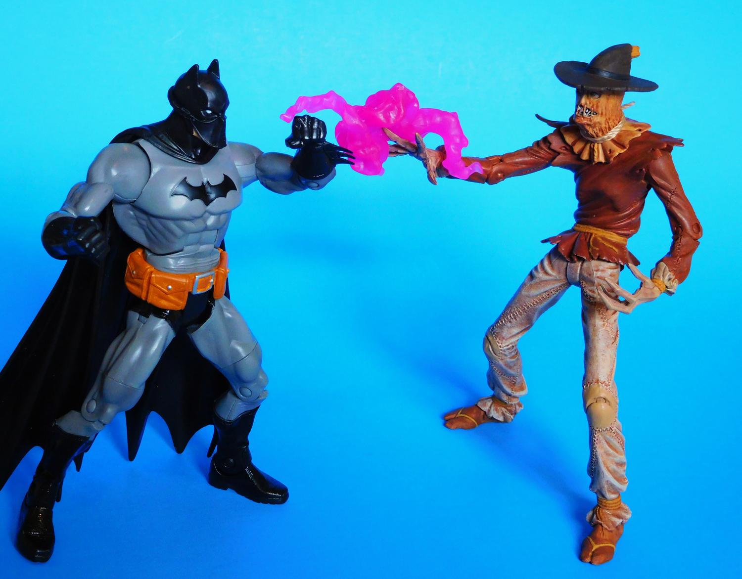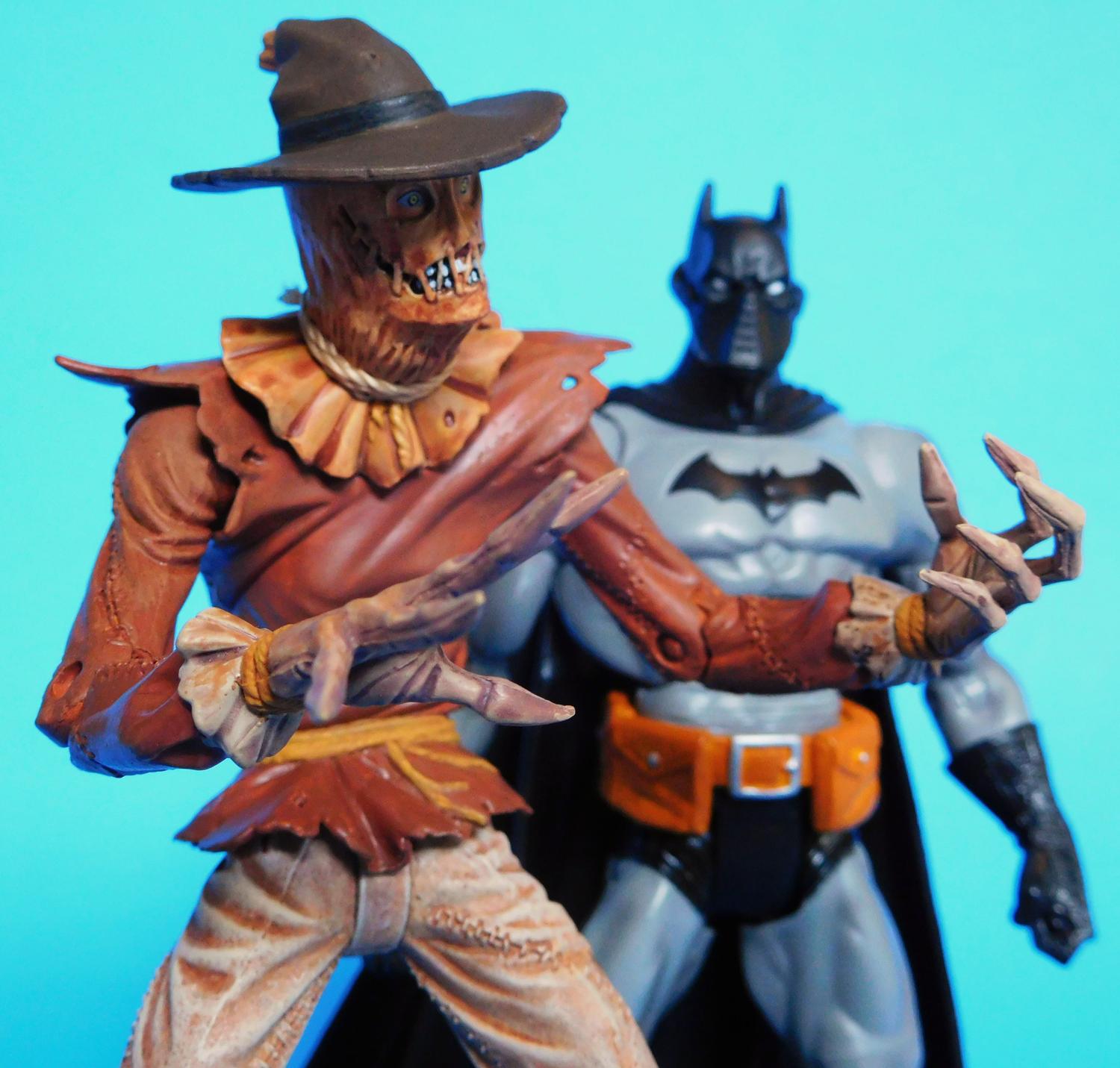 I popped the head off of the Hush Scarecrow and replaced it with the DCUC head. Unfortunately the Hush Scarecrow only has a swivel neck joint and I had to sculpt the neck onto the DCUC figure's head. I didn't really need to paint anything but the newly sculpted neck, but I thought it would be fun to do some drybrushing and paint washes. I was originally going to paint his shirt red like it was in the Animated Series but a lot of my Rogues already have red in their costumes, so I just did shades of brown instead to mix it up a little bit. I found a piece of string and wound it around his neck to save myself from having to sculpt it. He retains all of his original articulation. It's a little limited, but it's better than you would expect from a DC Direct figure. Anyway, I'm happy to finally fill this gap in my collection and he's pretty fun to play with and photograph.