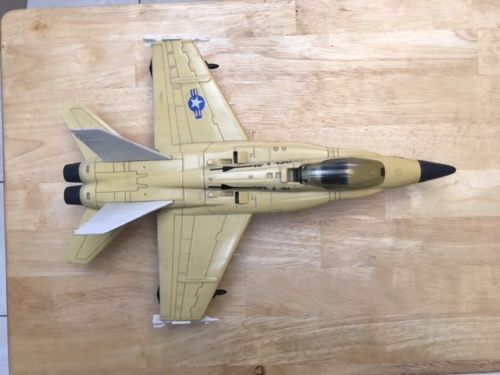 I am looking for a toy my cousin owned in the 80's-90's and tried to google it to no success. Basically it was a fairly large sized F-14 Jet (Apparently they also did an F-16 version and possibly helicopters as well) The most unique feature was that you would attach a black joystick-like handle to it and once attached it would make various sound effects for the plane. The joystick made it so you could easily manipulate the plane and it felt like you were piloting it. Any ideas guys? My cousin is looking for the brand name and hopefully if photos exist of it in and out of packaging on the internet. Thanks a lot in advance. The photos attached are someone on ebay who also doesn't know the brand this is apparently an f-18 hornet model.