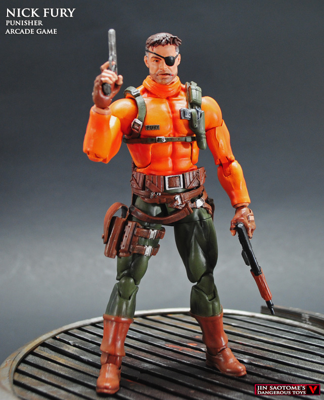 He's the director of SHIELD but this time he's teamed up with the Punisher for some vigilante justice, it's Nick Fury! The 1993 Punisher Arcade Game featured Nick as the player 2 character and here I created him in Marvel Legends form to scale alongside your Punisher from the retro/vintage card series of ML. Nick Fury uses the same Punisher body, modded Nick Fury head/webgear, and medium body feet. Demo man's belt/leg holster were used and various details sculpted using Aves apoxie sculpt. I originally painted his sweater a mottled brown color to match the game sprite but found the original Japanese game art depicting him in a much better looking orange and went with that, airbrushing the entire figure with shading and highlights. Add a stogie like he smokes through the entire game, even while fighting, and Nick fury was ready to fight alongside the Punisher!