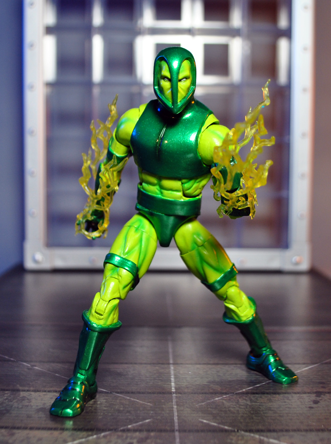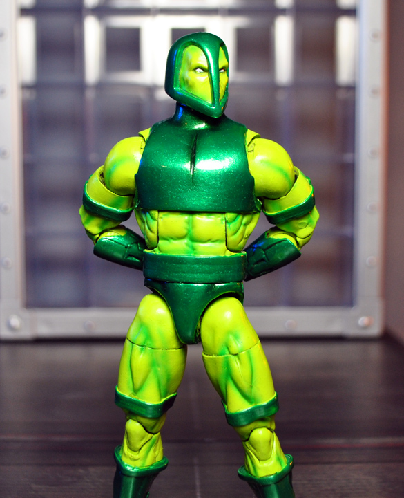 You've captured Venom, locked up your Rhino Build-a-Figure, and jailed Omega Red...but who's going to keep tabs on them? Enter the Vault Guardsman ready to join your 6" scale Marvel legends collection. This Guardsman was created using a Whirlwind body, Iron man lower arms/Legs, and a Eel head. All details were sculpted on using Aves Studio's Apoxie Clay, similar to Apoxie Sculpt but holds finer detail and sticks better to glossy surfaces. Guardsman was equipped with a repulsor blast and taser blasts to subdue inmates. Testors Aztek Airbrush acrylic metallic green was used for his armor and a mix of Games Workshop and Formula P3 paints for his lime green and shading were used.