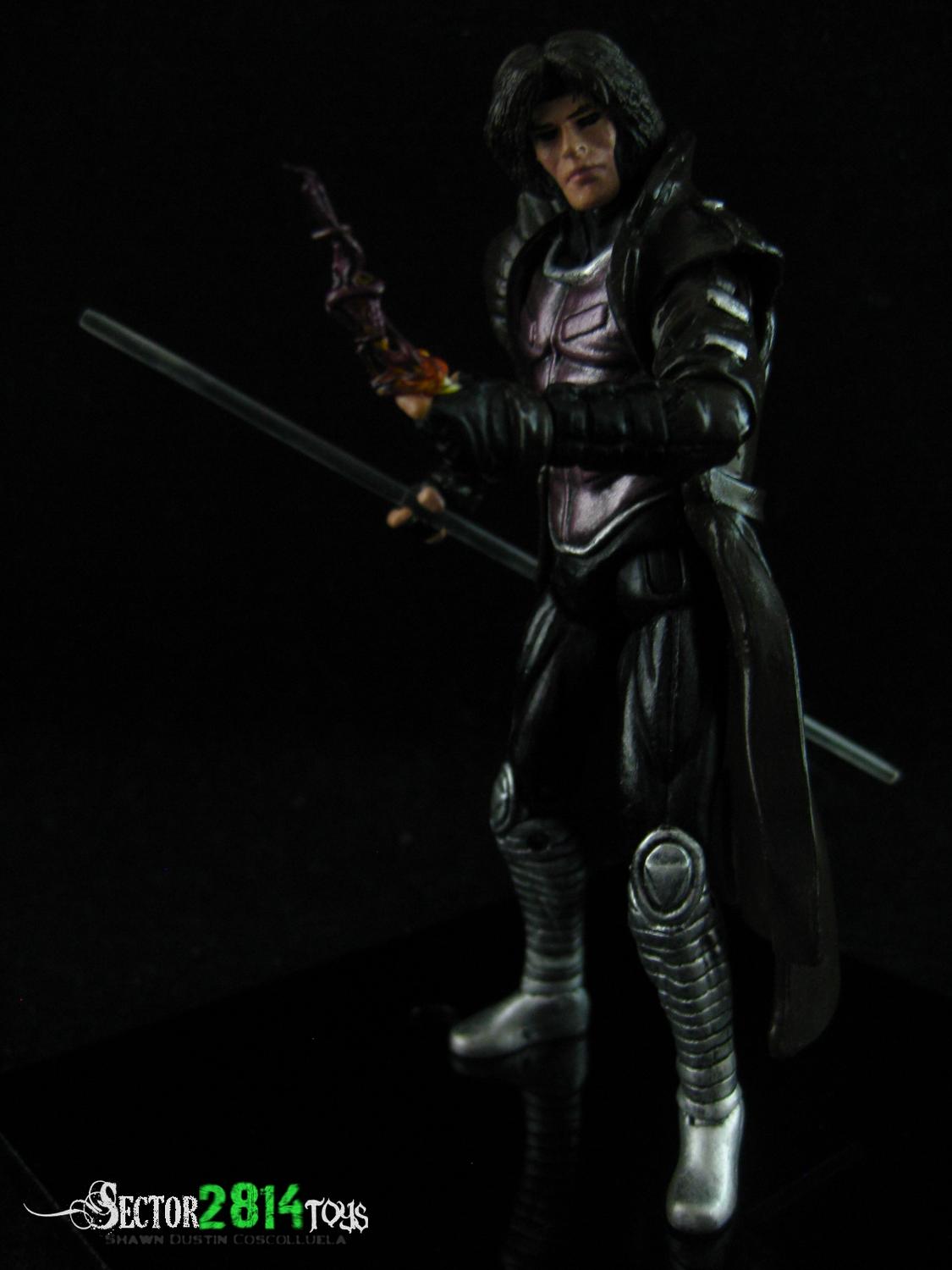 Here's Gambit! Before I talk about this figure, I'm now going to start putting my logo on each picture since I don't want anyone to copy them. I've also decided to base the design of my customs on what I think they would look like in my superhero universe. So with this figure, I've decided that this is a full-powered Gambit where none of his powers have been lessened by the operation Mr. Sinister did to him. (Yes, this means that he can blow things up with his mind now. LOL). I put a lot of thought into this figure since Gambit is my favorite character from the X-men story-line. He's all about being mysterious and always having his own agenda and that's what I like about ol' Remy. First off I never liked the pink/mauve outfit he wears in the comics and decided to darken the tone of that shade of color with my own version. Next I decided to keep the design of his outfit at a minimal and that meant no more patterns on the sides of his pants and no more armor parts on his collar bone area. I like how it turned out and it was what I was looking for. I also lengthened his hair since the long-haired Gambit was the one I like better. I was also very happy with how the jacket came out since I was going for a brown-leathery look. I changed the forearm part of the jacket to go with more straps and a more sophisticated feel. I also made his kinetic card that's already charged up to explode. You gotta go with the Ace of Spades on that one. Lastly I decided to put my own spin on his bo staff by making it transparent. (Just imagine Emma Frost gave it to him or something, assuming she can do that). I think it adds more flare to how Remy looks and makes him much more unique. Overall I really liked how this figure all came together and I was even surprised how minimal the paint rub was on the shoulders. I thought they would chip really easily because of how tight they were. I can't wait to make Rogue to partner up with Remy! Thanks and enjoy!
