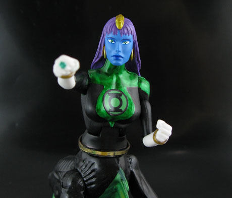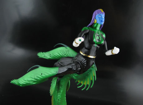 Mermaid Green Lantern? Yes, Mermaid Green Lantern. Introducing Lunessa Koinua swimming your way from the watery planet of Aeros. Fitting because she was made from the body of the Naut Kei Loi Movie Masters, fins swapped and turned upside down with some modifications to the body. The upper female half is made from a Katma Tui with a custom Zatanna cast head from Camco Kid castings which you can find in my Links page. A trident construct was created for her and Lunessa was ready to swim with the intergalactic fishes, see!