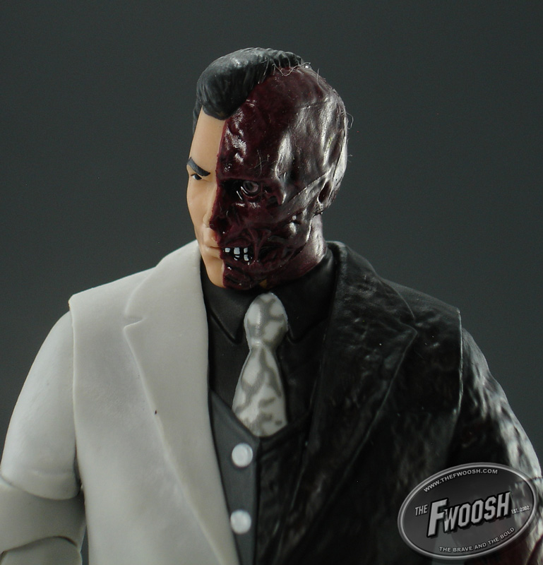 Two-Face is the 2-packs baddie. He's finally got some muscle to him this time around and the scarring is detailed and realistic, unlike the green or symmetrical scarring we've seen in the past. He comes with his signature coin, but it's stuck in his hand and can't be removed. His articulation is similar to DCUC figures, however, he has cut, not ball jointed shoulders. We got an explanation for this at Comic Con in that the different materials used to make the body and suit jacket did not come together in a natural way with ball jointed shoulders (think of a “vest” look) so aesthetically, they made the joint choice.