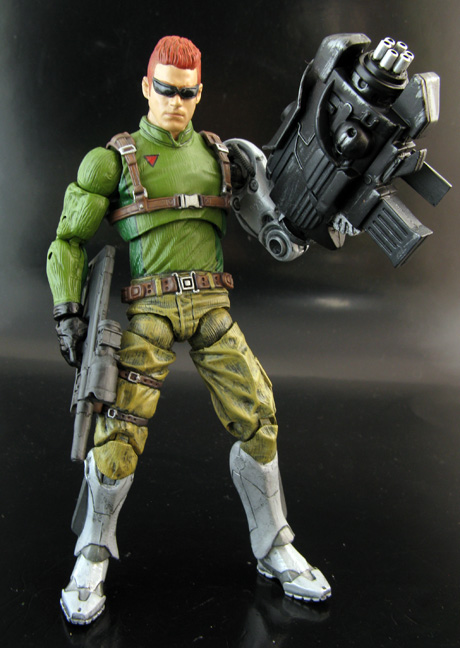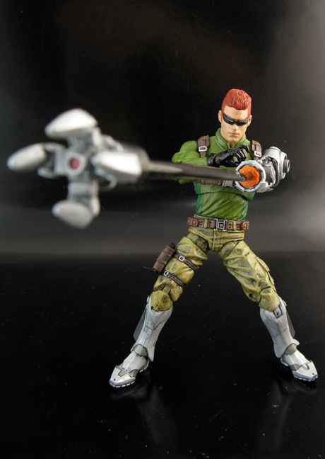 With so many Bionic Commando variations to choose from (original, Spencer, Rearmed, Rearmed 2) I couldn't decide which one to make. Then it hit me, why not make my own version by mixing all of them! So I took a little from each game's character and created a brand new 6" Bionic Commando. The base body is a Marvel Legends Winter Soldier, wrestling figure's head with sculpted shades, legs from Iron Man, Bionic Arm from a Transformers Ravage/Neo Shifters sections, Bionic Lance from a Starscream MechTech weapon, Bionic Gatling from a Heavy Metal Fakk accessory, and a custom made claw/wire grapple. Now Bionic Commando is ready to take on anything from army personnel to a tank!