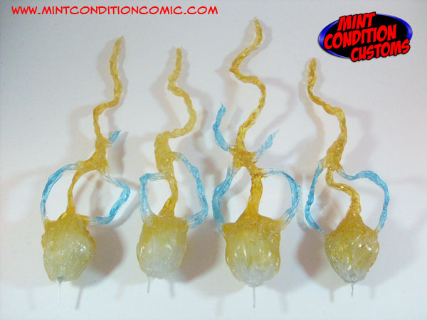 The real surprise in this set are the proton streams. The figures didn't come with any, but what's a Ghostbuster without a proton stream? I made 4 unique proton streams, using aluminum foil for the energy burst, and action figure clear plastic twist ties for the "skeleton" of the proton streams. I then used hot glue to sculpt over the "skeleton" to give it that wild energetic look. I made an energy burst at the base of the stream to match the cartoon design for the proton stream. In fact I used several stills from the cartoon to capture the look. Down to the energy burst, the simplistic design, and the color scheme (in the cartoon it was yellow with some light blue energy sparks). And because of the fact that I used bendy twist ties as the skeleton, the proton streams themselves are posable! That's right, you can have the streams sway left or right, up or down, to have them chasing after a ghost! You could also pose all 4 'busters together and have their proton streams intertwining for a "crossing the streams" display!