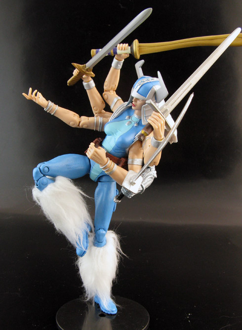 Hey look, Spiral! This six-armed-swordswoman is an extremely formidable opponent in the comics but she needed more articulation to be as formidable in plastic. Her lower waist section was modded to fit Maria Hill's legs/hips which were added. Pockets were swapped and then I thought, why use the old boot fur when I can make new? I used the fur from a christmas stocking and trimmed it to wrap around her ankles. A quick paintjob later and Spiral can pose a lot better for those dance moves!