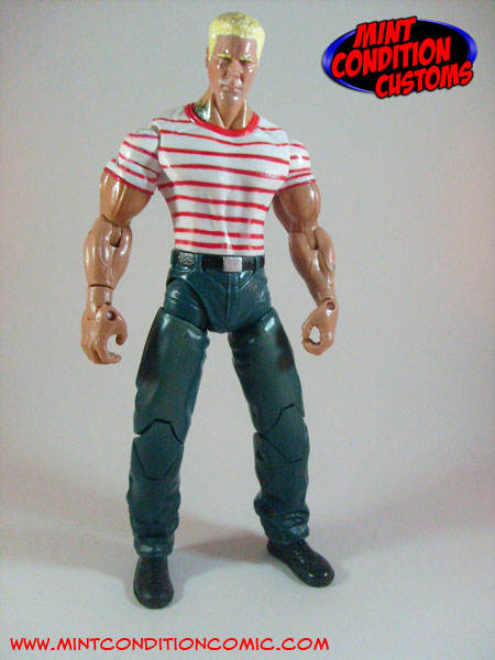 I sanded off the Strike Force logo on Tito Santana's shirt, as well as the goatee on Kevin Nash's face. Then I painted Kevin's hair a light yellow with a white wash to get a blonde look, and did the same to his eyebrows. I used a mix of a flesh tone, some red, and a little black to paint the scar on his eye. The black was used because I noticed it left kind of a burnt edge to the paint which would look great for a scar.
