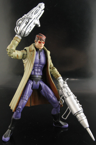 Aaron Stack the Machine Man from Marvel's Nextwave comic is an awesome character. Take Bender from Futurama's personality and stick him in a robotic Mr Fantastic and you have Aaron. I wanted to do his real justice for my first Machine Man custom! He's made from a DC Universe Captain Boomerang body/coat, Sandman Arabian Nights hands with modded slicy-fingers, custom sculpted head, and all sorts of fodder weapons/parts for his attachments. Those attachments include a lightsaber thumb, extendable arms, blaster hands, gun-finger with muzzle flash, and buzzsaw arm.