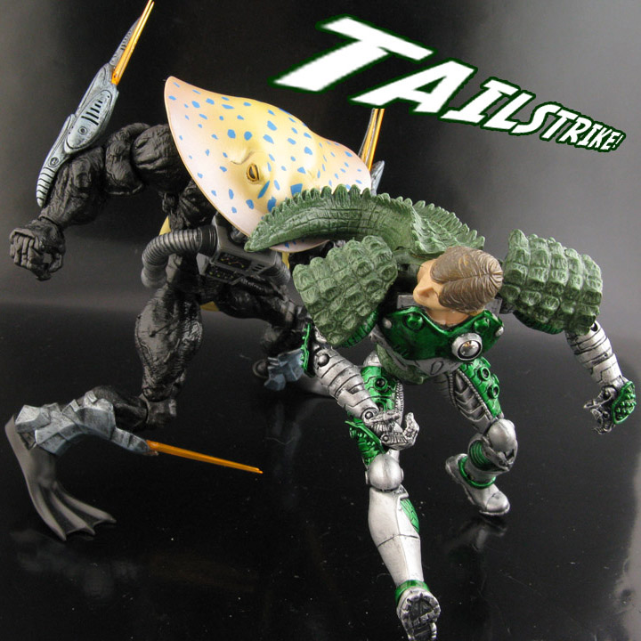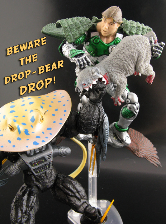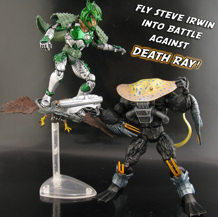 You know who he is, the familiar shout of "CRIKEY!" still lingering in the hearts and minds of people everywhere. Steve Irwin was a great hero in life, so great he deserves to be a superhero. Here Crocodile Hunter Steve Irwin gets the superhero treatment and is pitted against his deadly adversary, Death Ray. Irwin was made from the head of the talking Walkabout Steve Irwin action figure, LCBH Super Patriot body, and ML Face Off Red Skull forearms. His chest armor came from Batman and croc-helmet from a DCD Armory Aquaman.His tail, shoulderpads, Croc-Rocket punch, and belt came from a toy alligator. The Hawk-board was made from a Spiderman 3 Green Goblin flightboard and Drop Bear from a toy koala.