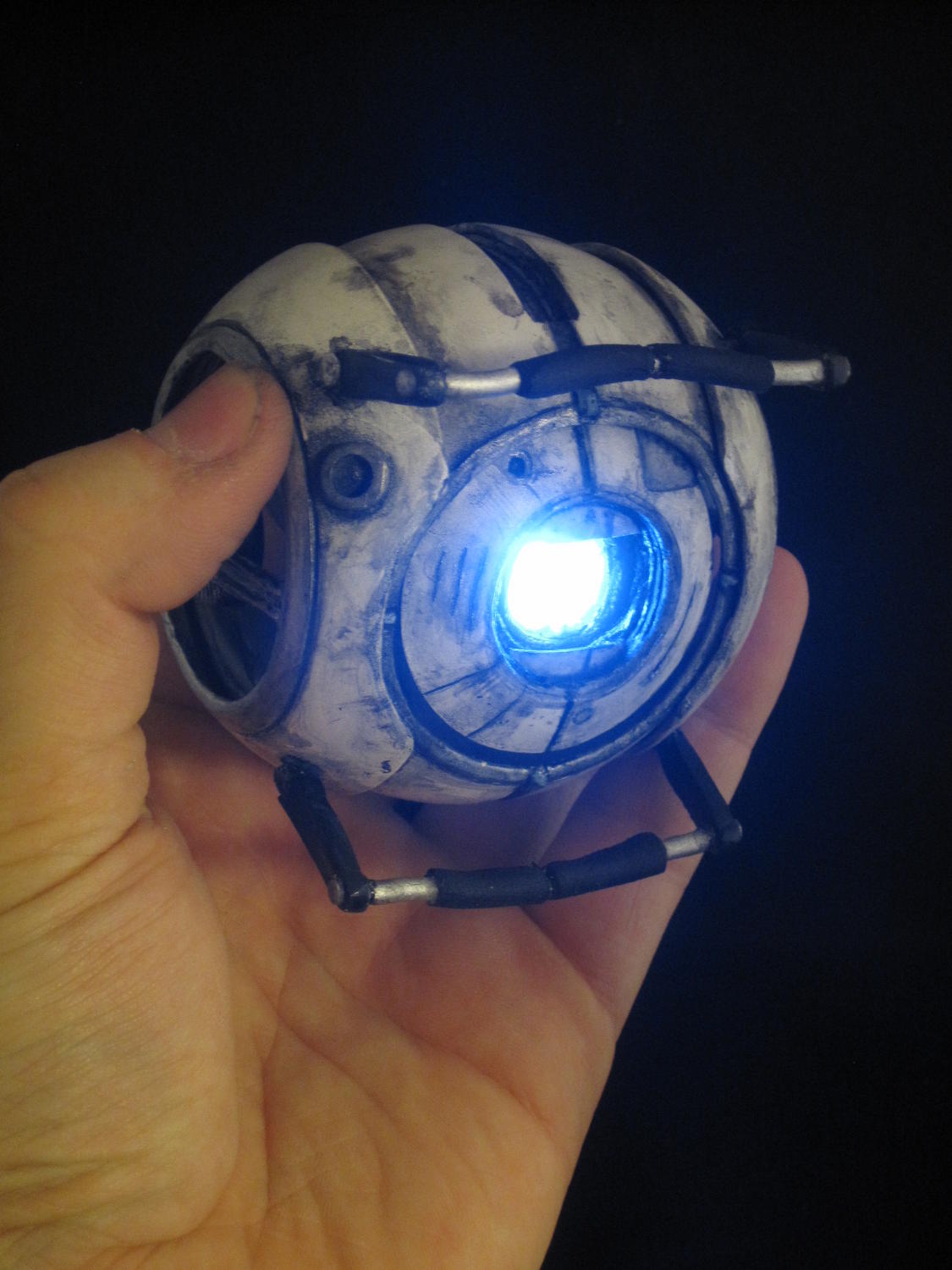 here are some raw pics of the newest portal 2 custom i have made. same recipe as the last wheatley i did but this time with a more weathered paint job and some bumps and scrapes added to him. The light on him is pretty strong so I apologize for the washed out look on him.