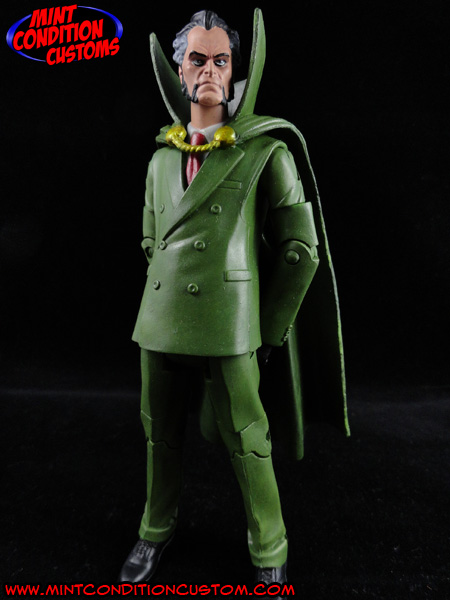 The new suit body was much better and proportionate than their last one and perfect for Ra’s Al Ghul. And the fact that the suit was already green helped greatly. The cape is from a DCUC Alan Scott Green Lantern, and the head is a custom resin cast of the DC Direct Hush Ra’s Al Ghul head.