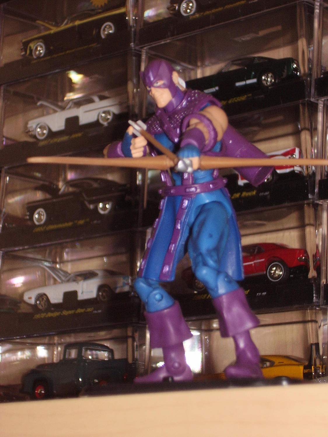 playin around with hawkeye. I wanna do a really nice display when I get my new stands in. Might have him like jumping in the air shooting his bow, at that point I'd glue the arrow to his bow.