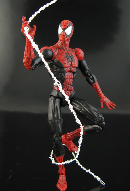 With so few decently articulated Spiderman figures out there here's one done in a 6" 2012 Marvel Legends style. He was made from a McFarlane Spiderman torso with arms, waist, and legs from an older Spider-sense spiderman. His head came from the most recent series and the eyes modded. Powerful magnets are buried in his feet so he can stick to metal surfaces. The range of motion in his joints was extended by removing/adding plastic and he was given a metal wire webline he could stick to as well as a web-cast. Black and red make him stand out, this Spidey is ready to take on anyone!