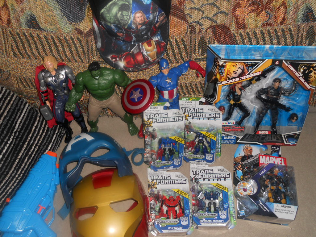 Me and my 3yr old son spent the whole day toy hunting and at the end hit Chuck E Cheese for some pizza. MY son scored the Avengers talking Cap, Hulk, Thor, Avengers hat, 2 squirt guns, Cap mask and a Iron man mask. I already watched a downloaded version but now were going to see the Avengers in the theater in morning. I grabbed MU Cable, TF Prime Cyberverse Breakdown, Evac, Mirage, Arcee and the last Widow & Winter soldier ML 2 pack at TRU for $20. I also got my Ghost rider variant in the mail today. Just had alot of fun today...