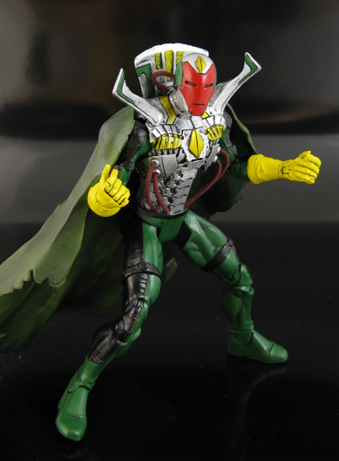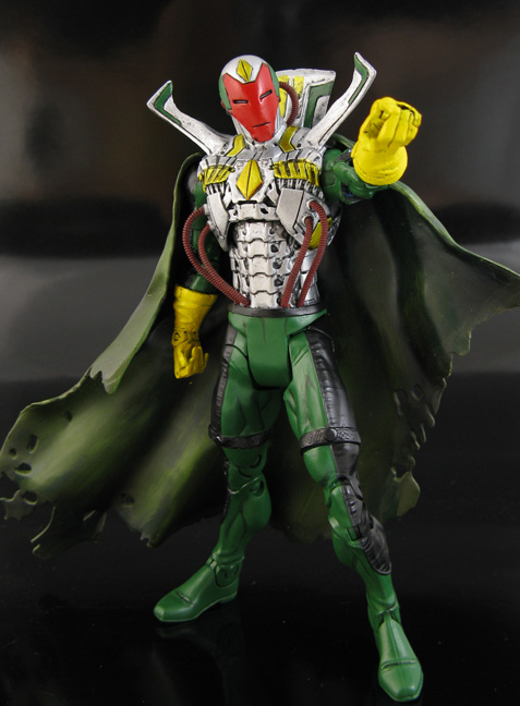 In the shadows of Tony Stark's design shop the Vision Mark I's processors whir to life. Wait, he wasn't in the Avengers movie...but he should have been! Here's an Avengers Movie style 6" Marvel Legends Vision. The back story I came up with has Ultron creating Vision from parts in Stark's shop, thus the Iron Man-esq looking face. He was made using a Mark V upper body, Black Hand DCU lower half, Movie Mr Fantastic arms, and Extremis Iron Man head. Various sculpted sections and fodder parts were added to made him look partially complete, Android parts still showing.