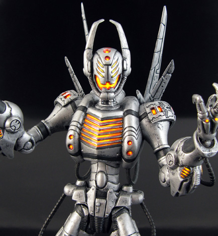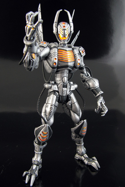 Ultron is one of the Avengers deadliest adversaries and was created by one of their very own. Here I've done the creating and present to you my idea of how Ultron may appear in Avengers 2. Following movie canon this is a Phase II Ultron created from Destroyer tech the same as Coulson's rifle. He goes berserk and seeks out his creator, Dr Pym aka Ant Man. This figure was created from a DC Universe Braniac, custom sculpted head, MARS parts, and ML Ultron feet along with lots of fodder bits and hoses. I gave him Destroyer-like fireblast ports all over him, two wrist blasters, and an energy shield/blade.