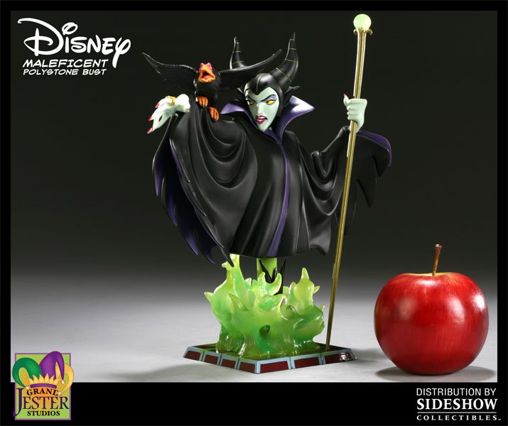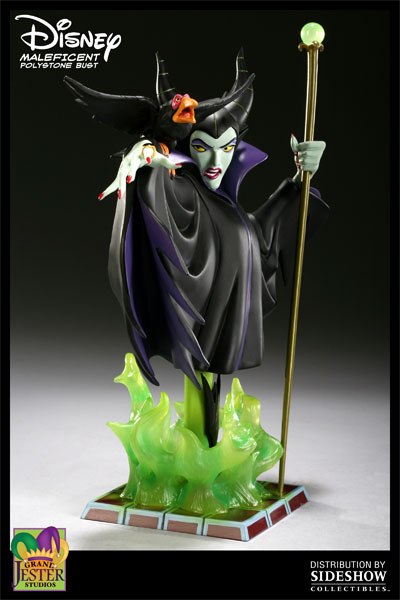 Wreathed by translucent green flame and black-hearted malice, the seductively sinister Maleficent commands all the powers of darkness to do her cruel bidding. With her ebony-winged raven, Diablo, perched atop one outstretched arm, the self-proclaimed "Mistress of all Evil" is a frightfully beautiful sight to behold. Crowned with a horned hood and draped in flaring robes with a glass ball atop her staff, this character authentic, polystone mini-bust is designed and sculpted by Disney animator Ruben Procopio. Standing 10.5" tall and 9" wide, Maleficent comes painted and ready to display in celebration of the 50th anniversary of Walt Disney's Sleeping Beauty.