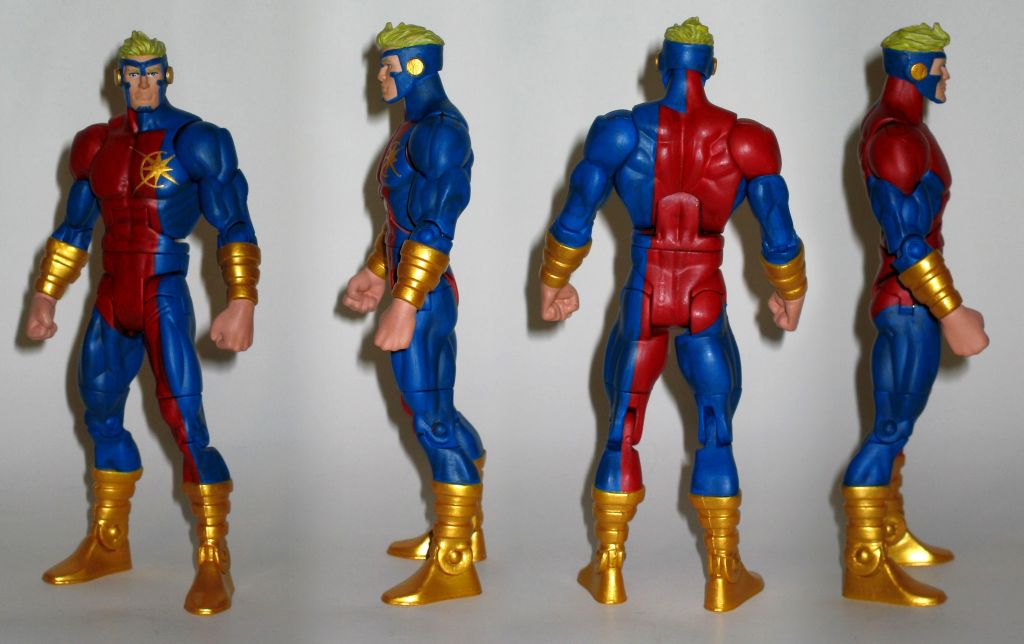 Atom Bob is made from a Johnny Quick main body; biceps, forearms, fist, lower legs, and feet OMAC; and the last part a Superman Blue head. I had a couple of first with this figure it was the first time trying to paint eyes and also the first time hand painting a logo. It was Atom Bob's logos success that finally made me finish my Iron Fist. Oh the ear covers were colored differently at times in the comic, sometimes they were blue others they were gold. I went with the gold which personally I think looks better. Let me know what you guys think.
