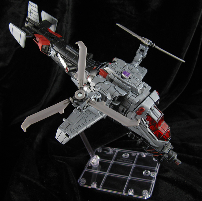 Here's a cross between a Generations look and the Animated Transformers look for Megatron using the twin-propeller helicoptor form. The head is from a 2-pack Deluxe tank-Megatron, body from DOTM Skyhammer, prop engine joints from a megablocks Halo figure, and rotors from two of those PCC Searchlights. I modded a DOTM Jolt mech-tech weapon to fit under the helicopter folded up and extend to full size for Megatron's cannon. The props unplug and fit behind his shoulders or the blade attach on his forearms in robot mode. I hard-edge-highlighted everything to add detail and gave him some shoulder plugs to simulate Animated Megatron's design even more. His chest rotor was removed and the inner post locked in place so the Decepticon symbol (Meantime chest) I added stayed vertical even when you turned the chest to transform. A figma stand makes a perfect flight base and Megatron is ready to take to the skies and rain fire down on some autobots.