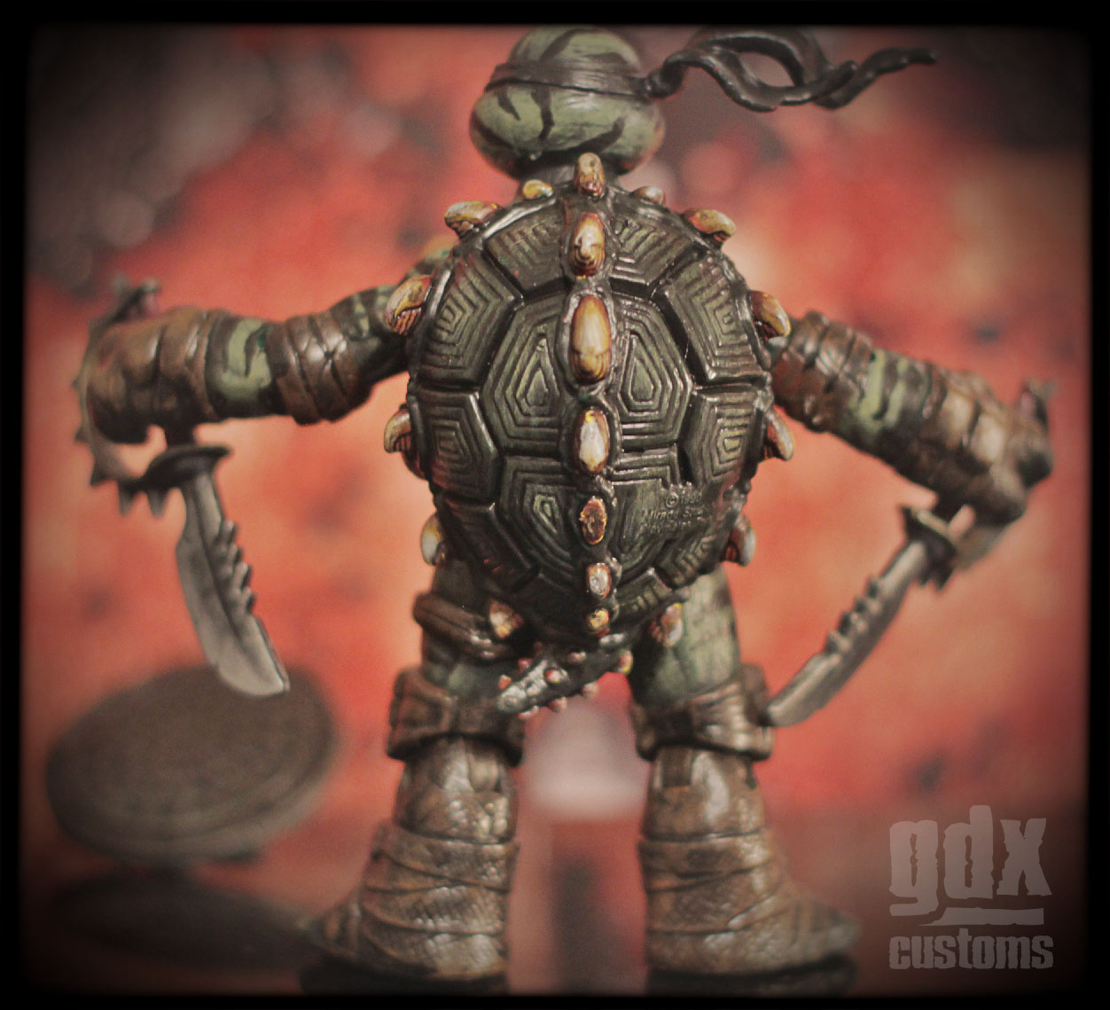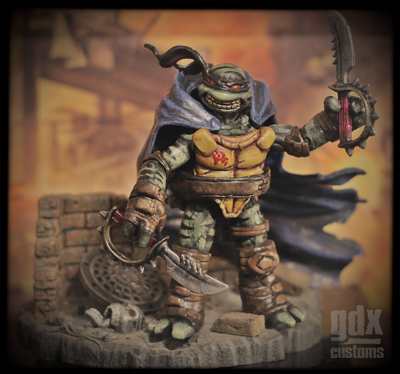 He uses a 2012 TMNT Raphael, and parts from a vintage 1988 Slash.