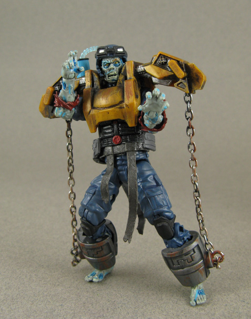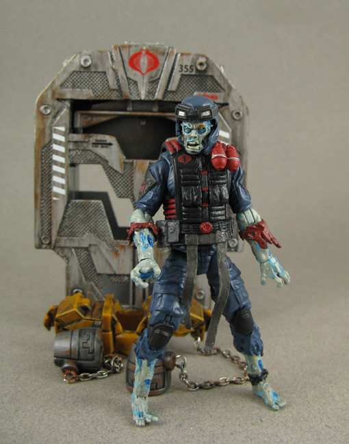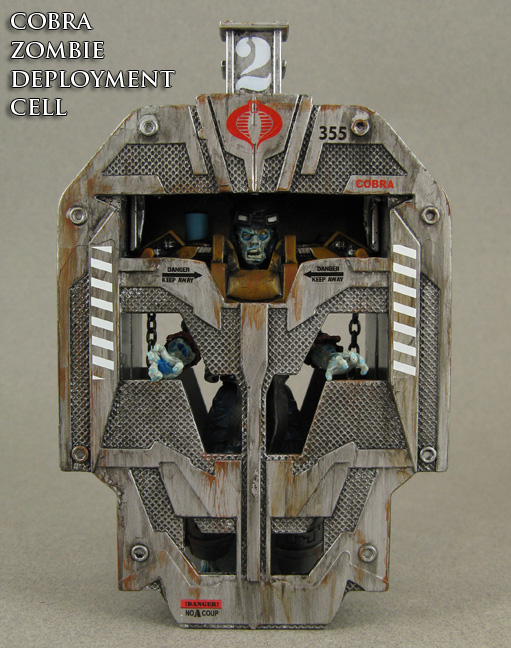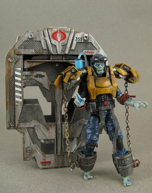 A cobra Zombie Viper was combined with a Cobra Viper and with his vest on he fit into the armor, the manacles attaching to his feet or hands. The zombie could now be loaded into the armor-launcher and transported that way until it was time to deploy him on the Joes! You could use these as B.A.T. deployment cells, mutants, prisoner cells, whatever really.