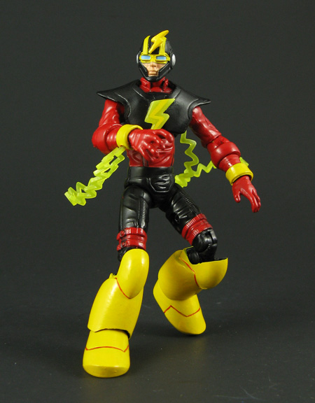 Here's another Megaman Alterverse character with a charged personality, Elec man! He was made from a Crimson Guard, Hydra Agent head, Avengers Skrull chestplate, comic Iron man lower arms, RoC The Doctor legs, and Black Ox Revoltech lower legs. Elec man gets an electrical blast beam to ride around on and is decked out in classic Elec man design details.