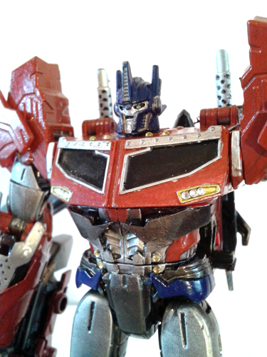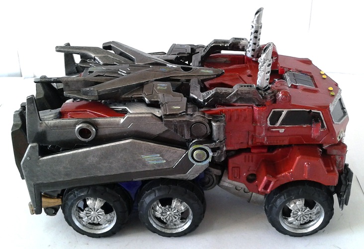 This figure had terrible looking guns that bore no resemblance to anything in the cartoon and his hip and thigh joints were too floppy to support his meagre 5g of bodyweight. He came with a nice sword but as Optimus didn't use it after he upgraded to this body I didn't paint it. The more work I did on this toy the more details I noticed could be improved. I removed the stomach spikes and covered up the area with dark plates but couldn't think of a way to add the other, brighter plates without hindering the transformation, so that detail is still missing but it's still more accurate than yours!