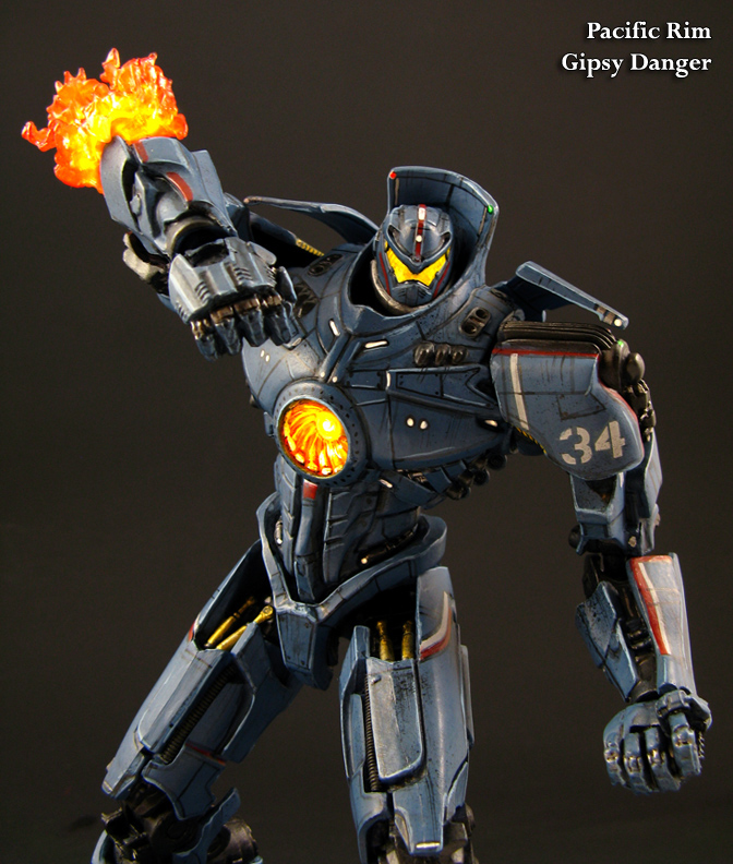 Another Pacific Rim custom figure is ready for deployment and this time it's the star Jaeger of the movie, Gipsy Danger! The NECA 7" figure was taken apart at the ebows and given Transformers human alliance scout limbs that were double jointed. The same was done for the hips to allow for more range articulation, knees, and ankles allowing Gipsy Danger to block, grapple, and even kneel. A Ghost rider flame section was modified for the ELBOW ROCKET! blast, two scratch made chain swords that magnetically attach, and Plasma caster created from a Star Wars droid accessory. Gipsy Danger was then given a full paint job that required over eight hours of detail work with the armor shading, scuffing, blast splatter, edge highlights, light effects, and complete micro panel line additions based on the movie stills. Pacific Rim's Gipsy Danger Jaeger is now ready for deployment once again!